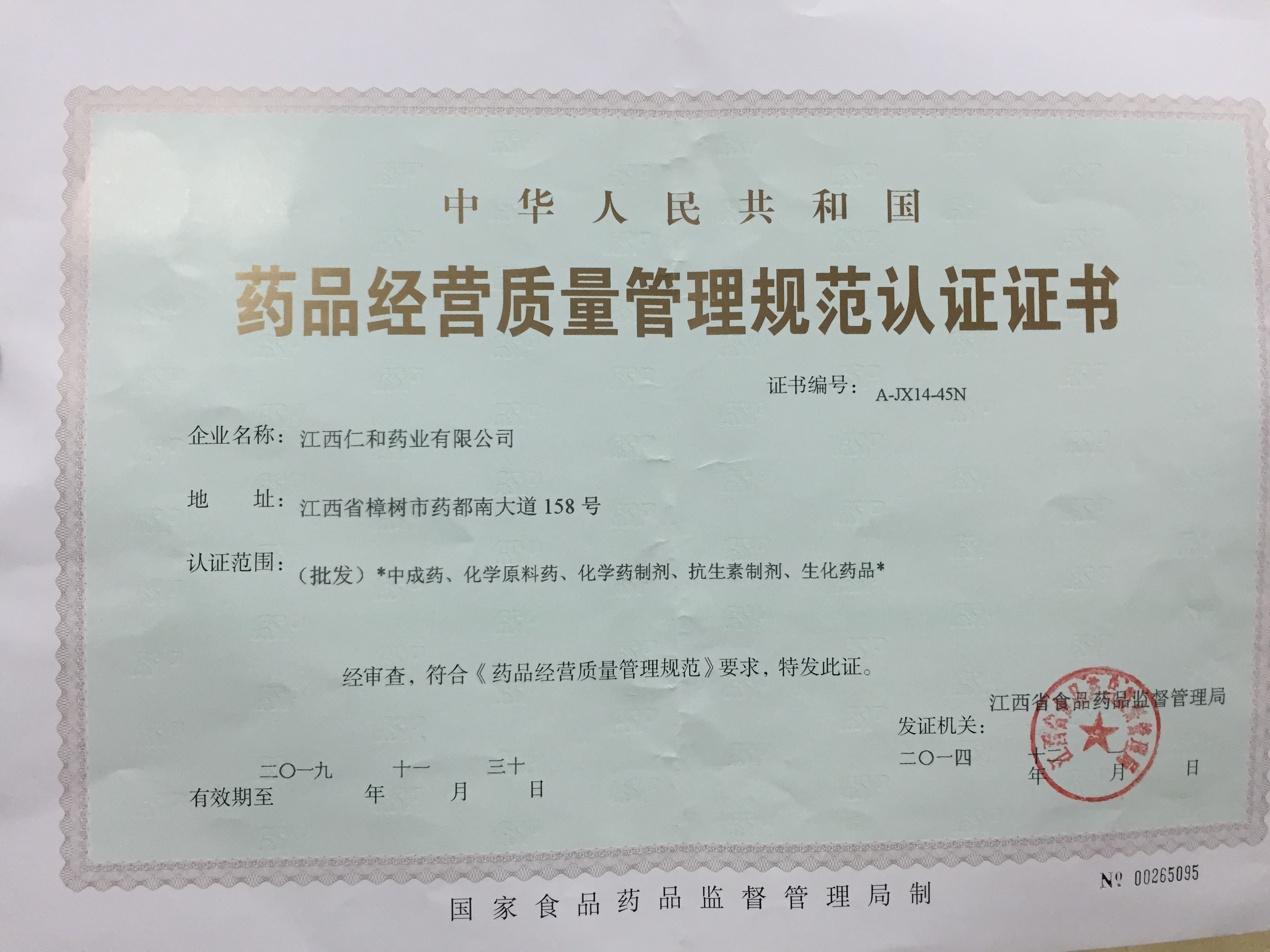 2014年10月30日,江西省食品药品监督管理局委派的GSP认证专家组现场宣布仁和药业通过新版GSP认证现场检查,经过一个多月合法合规的公示程序后,12月8日,仁和药业喜获新版GSP认证证书和药品经营许可证。