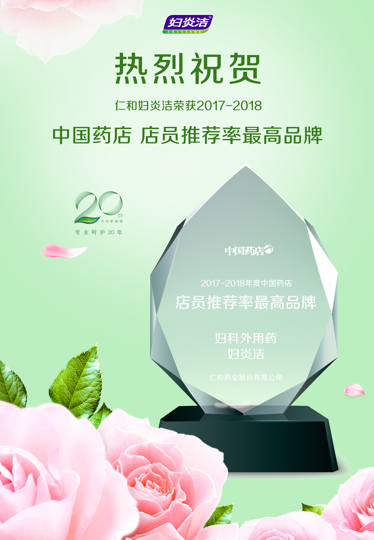 2018年10月23日,第十八届中国药店高峰论坛在青岛盛大开幕。本届峰会围绕“聚合·智变,激荡大时代”的会议主题,邀请业内专家学者、连锁、工业代表等行业大咖,对“大市场”、“大连接”、“大健康”、“大竞合”、“大品类”和“大突破”等论题进行深入探讨,共寻大时代背景下的行业发展之路。 当晚举行了“2017-2018中国药店店员推荐率最高品牌”颁奖礼,仁和药业旗下女性洗液领导品牌“妇炎洁”以过硬的产品质量、良好的口碑以及颇具影响力的品牌价值,再次榜上有名,荣获妇科外用药2017-2018中国药店店员推荐率最高品牌。