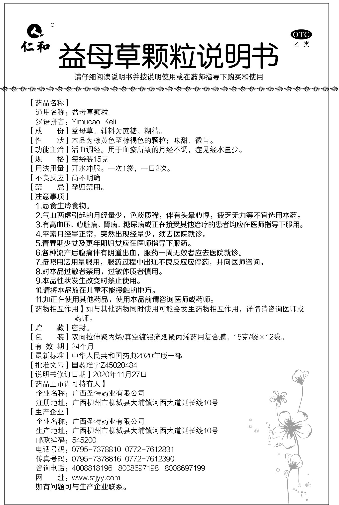 益母草颗粒 编辑时间: 2019年10月09日 浏览量: 12,739 【批准文号】国药准字Z45020484 【主要成份】益母草。 【用法用量】开水冲服,一次1袋,一日2次 【功能主治】活血调经。用于血瘀所致月经不调,证见经水量少。 【包装规格】15克/袋×12袋/盒 下一产品:复方金银花颗粒上一产品:蒲公英颗粒